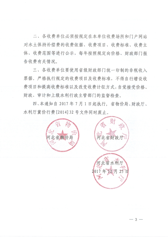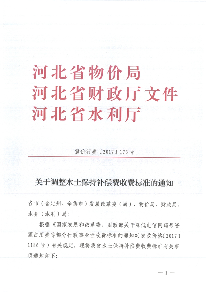 冀价行费〔2017〕173号关于调整水土保持补偿费收费标准的通知